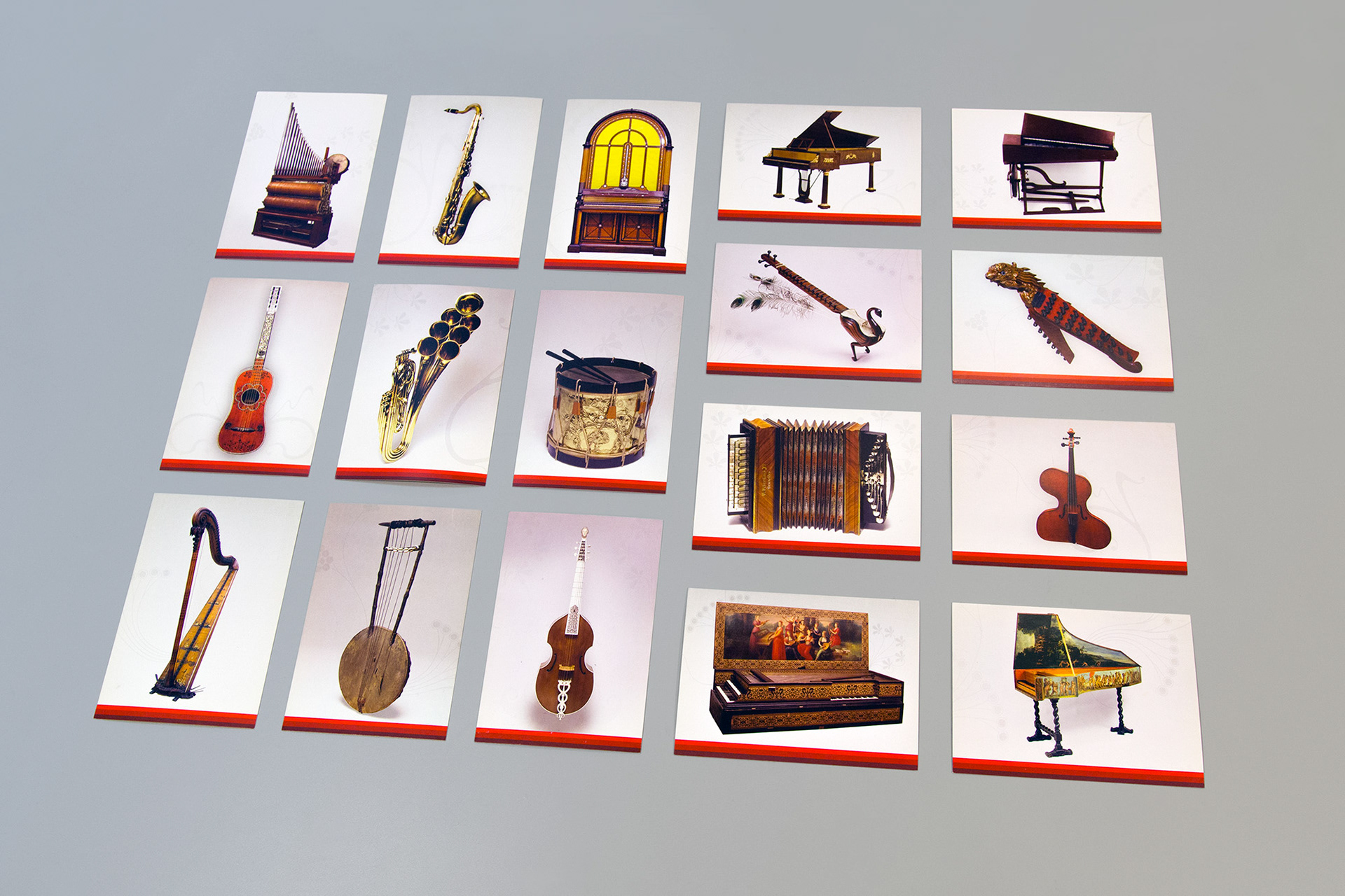 The brand identity was also applied to merchandising, like postcards featuring instruments from the museum's collection.